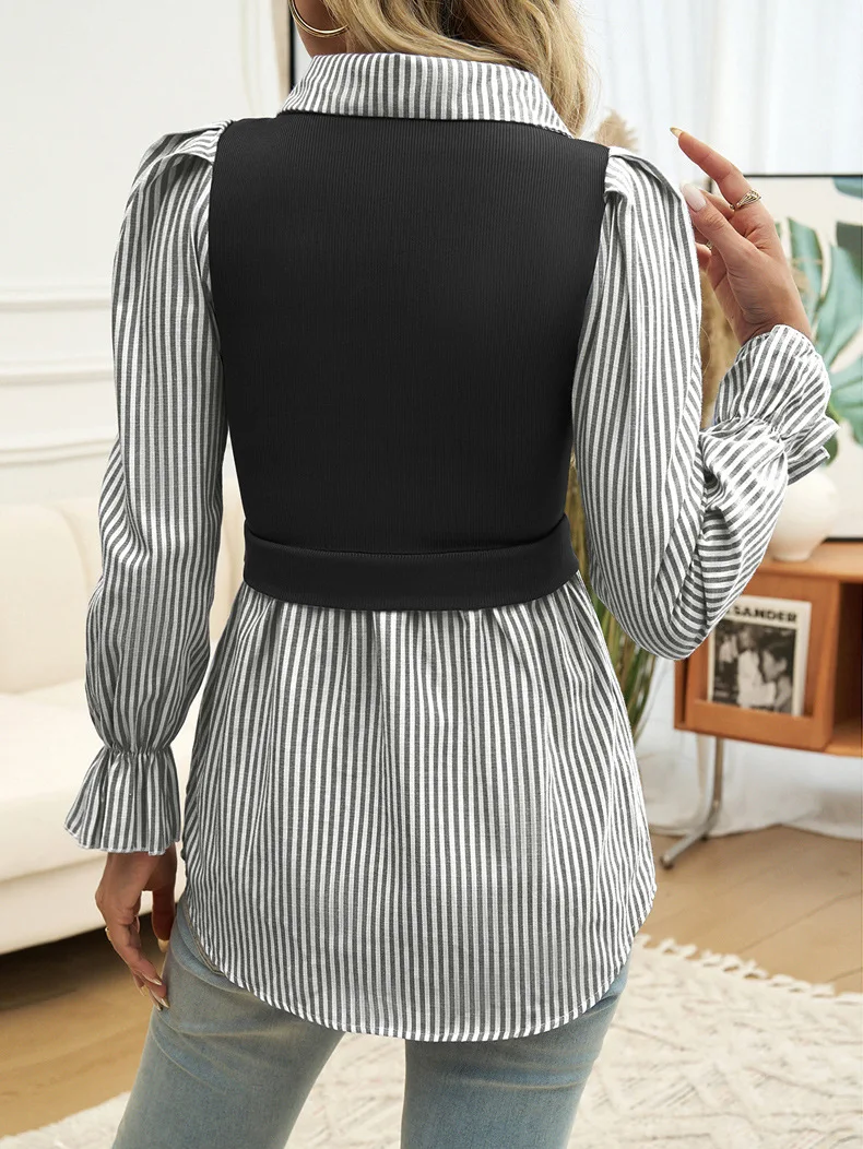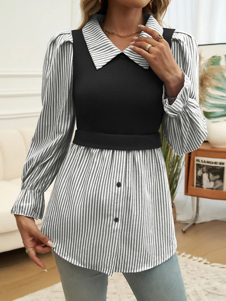 Women Long Sleeve Shirt Buttons Patchwork Tops Lapel Neck